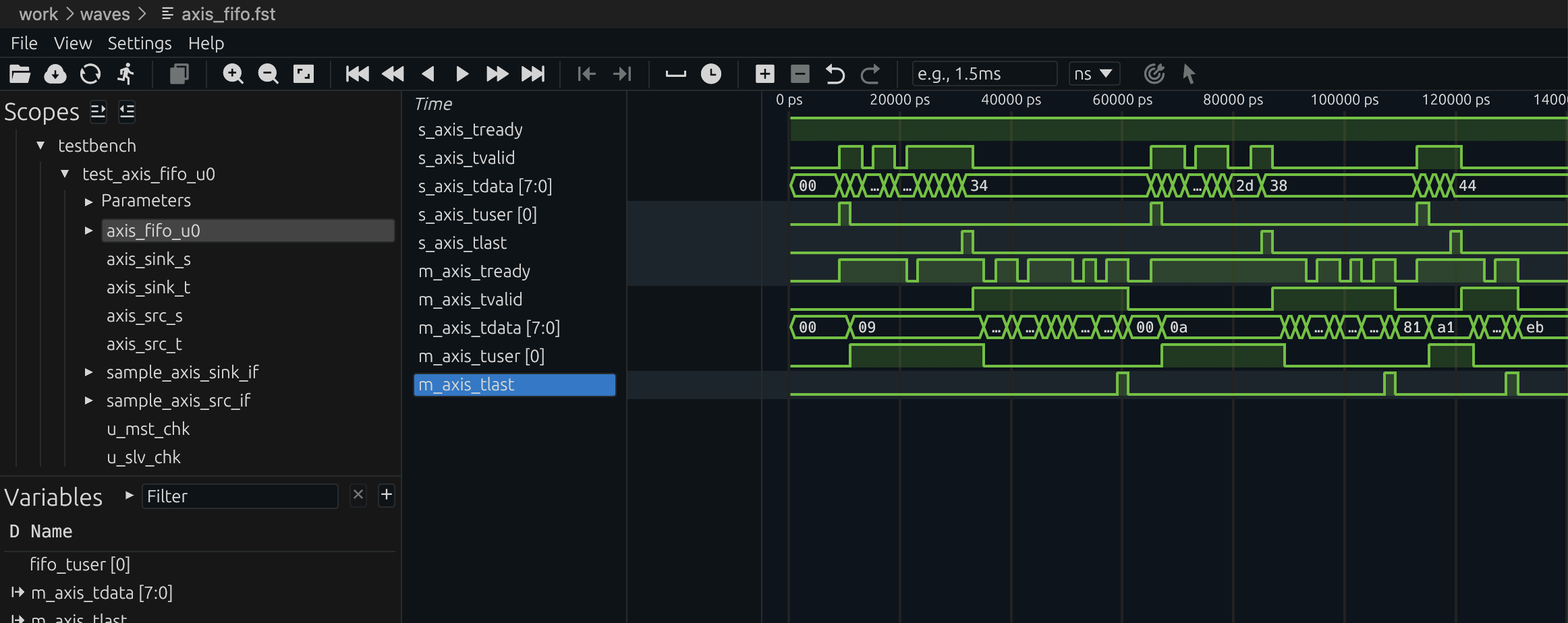 Figure (5): AXI-Stream async FIFO in frame mode. The output side waits until TLAST has been written before beginning to drain. Waveform captured from verilaxi.
